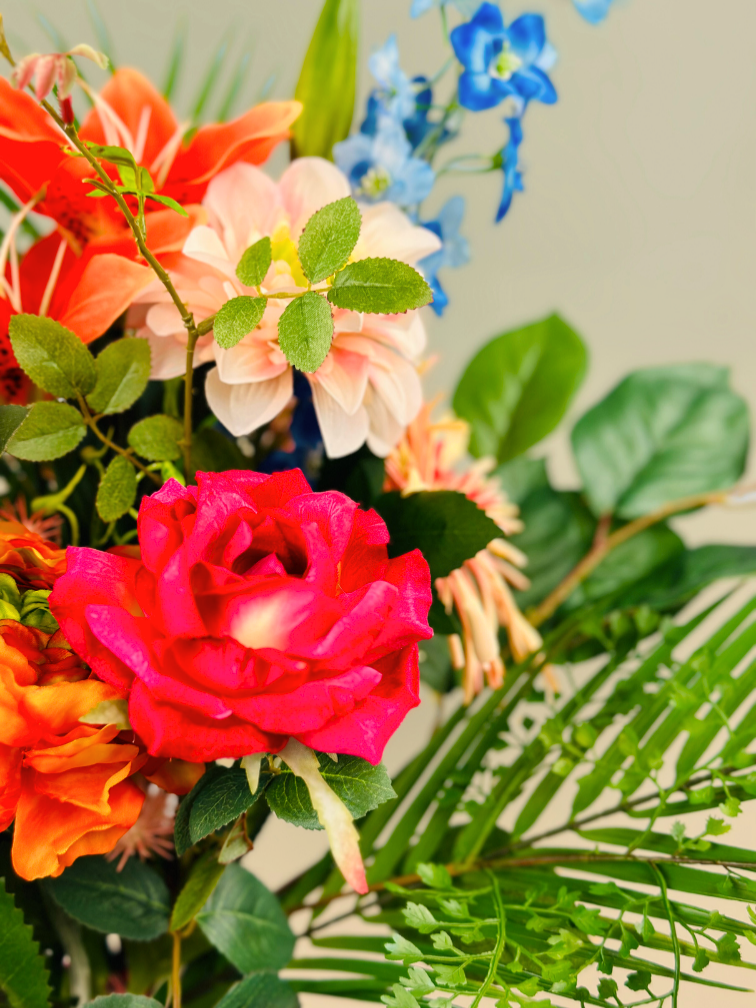 - Materialen: Zijden bloemen, stijlvolle vaas