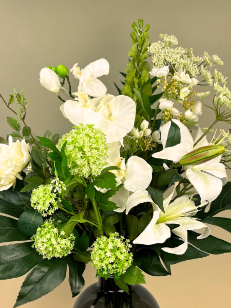 - Materialen: Zijden bloemen, stijlvolle vaas