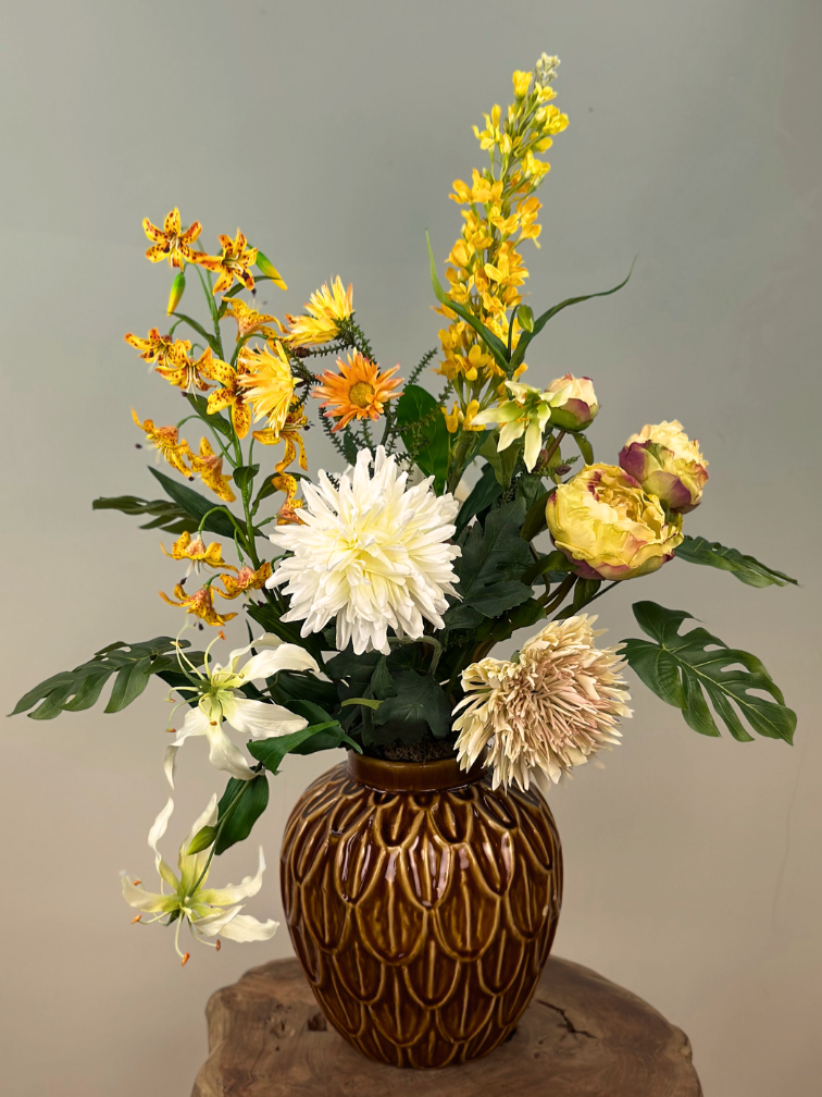 Zijdenbloemen boeket 'Sunny Day' is samengesteld in onze trendy 'Jacqueline' vaas. Het boeket bestaat uit prachtig geel gekleurde zijdenbloemen. Met dit zijdenbloemen boeket haal je een echte sfeermaker naar jouw huiskamer!
