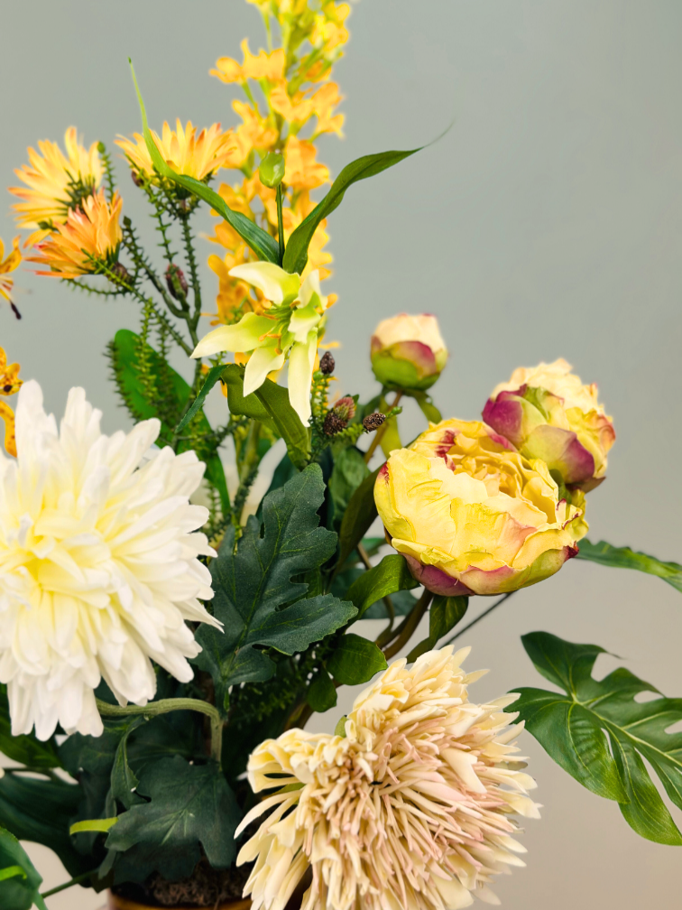 De naam verklapt het al, zijdenbloemen boeket "Sunny Day" is samengesteld met fleurige geel gekleurde zijdenbloemen. Een echte sfeermaker voor in huis!