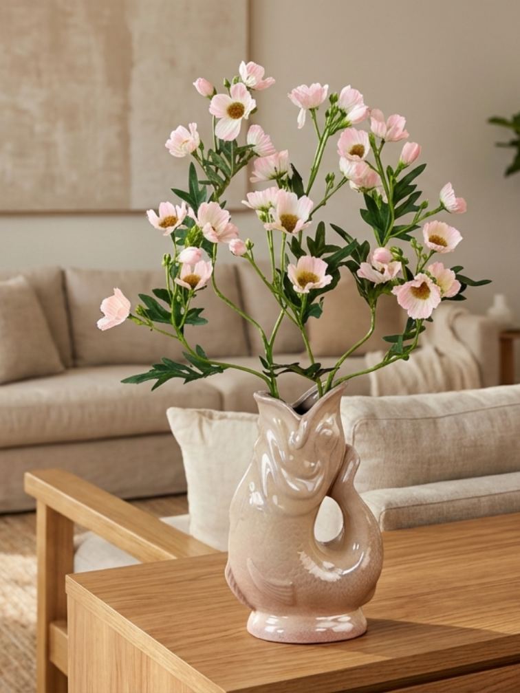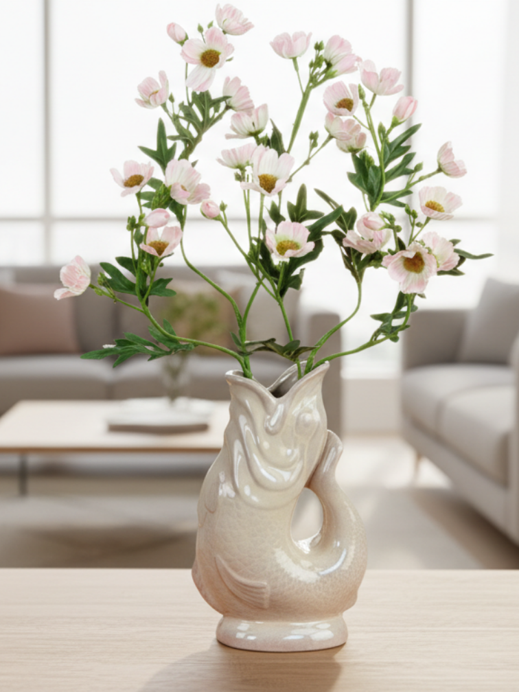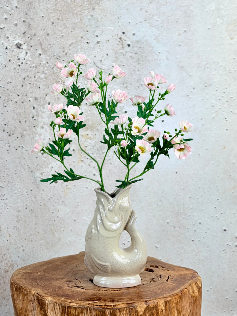 Ons zijden bloemen boeket "De Bloemlip Vis" bestaat uit volle zijden bloemtakken van roze Klaproosjes. Het boeket is gestyled in onze Beige Vis vaas.