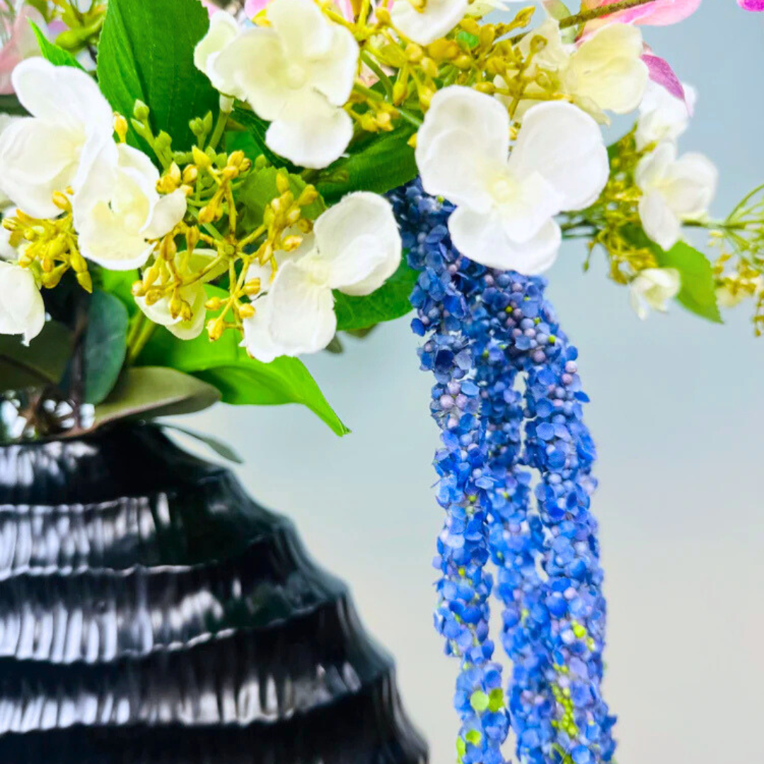 De bloemen zijn prachtig gestyled in de populaire zwarte ovale vaas, die het geheel een moderne, chique uitstraling geeft. De strakke vorm van de vaas vormt het perfecte contrast met de zachte, luchtige bloemen, waardoor het boeket zich thuis voelt in zowel een minimalistisch als een klassiek interieur.